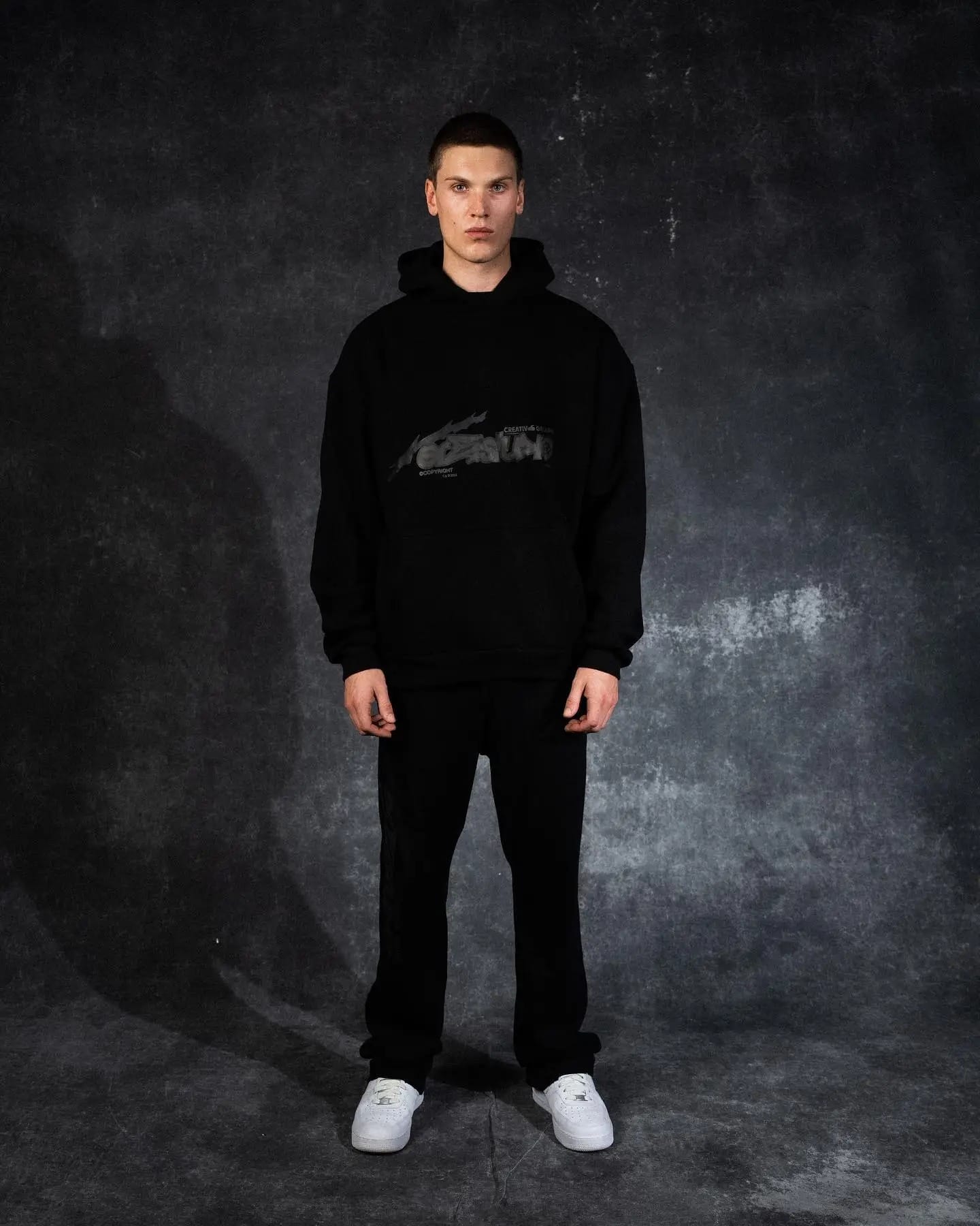 Begib dich in die Nacht mit dem Ere Studios Midnight Trackie Hoodie in elegantem Schwarz. Dieser schlichte und doch stylische Pullover-Hoodie besticht durch eine dezente, tonale Grafik auf der Brust, die nahtlos mit dem Stoff verschmilzt und einen raffinierten, geisterhaften Effekt erzeugt. Das Design enthält Texte wie „CREATIVE GROUND“ und „ und verweist auf die einzigartige Identität der Marke. Mit seiner bequemen, entspannten Passform ist dieser Hoodie ein vielseitiges Basic für den Lagenlook oder ein stilvolles Statement in der Freizeit. Perfekt für alle, die minimalistisches Design mit dem gewissen Etwas schätzen.