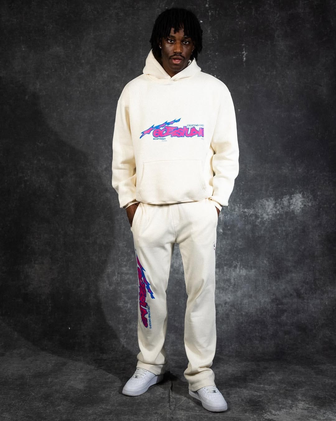 Der Ere Studios Midnight Trackie Trainingsanzug in Creme bietet einen cleanen, stylischen Look mit lebendigen Akzenten. Mit einem Reißverschluss-Hoodie und einer Jogginghose mit farbenfrohen Grafikdetails an Ärmeln und Beinen vereint dieses Set Komfort mit Streetstyle-Flair. Aus weichem, atmungsaktivem Stoff gefertigt, eignet es sich perfekt für die Freizeit und zum Entspannen.