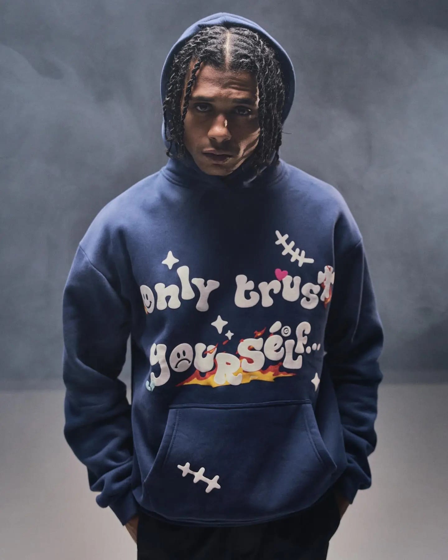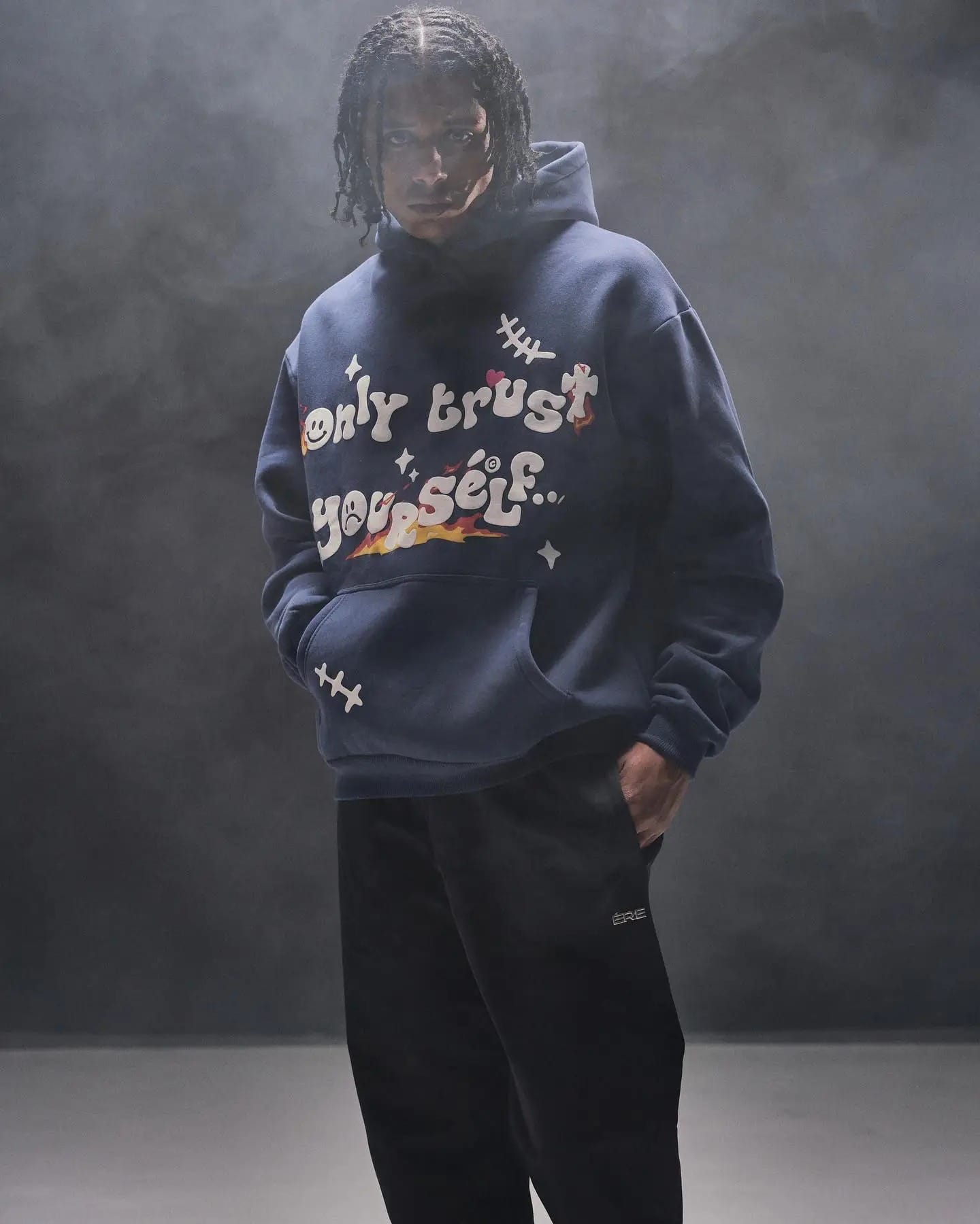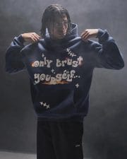 Zeige Selbstständigkeit mit dem Ere Studios „Only Trust Yourself“-Hoodie in sattem Dunkelblau. Dieser Pullover-Hoodie präsentiert eine leuchtende, mehrfarbige Grafik auf der Brust, die „Only Trust Yourself…“ verkündet, umgeben von verspielten Sternen und einem dezenten Smiley. Markante weiße Nähte an Ärmeln und Rumpf verleihen einen künstlerischen, dekonstruierten Touch, während die klassische Kängurutasche für Funktionalität sorgt. Dieser Hoodie ist bequem und stilvoll und ein Statement für alle, die ihren eigenen Weg gehen.