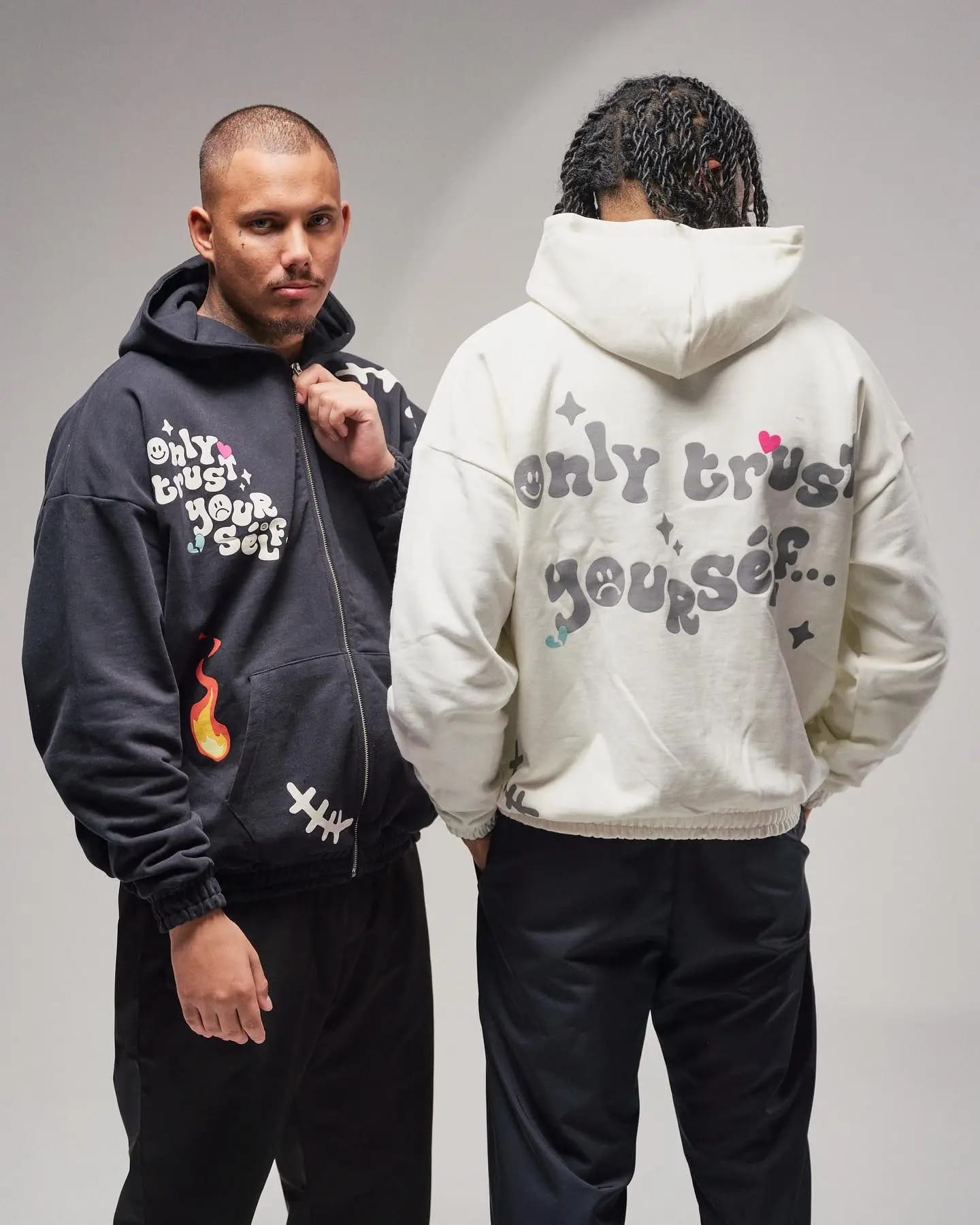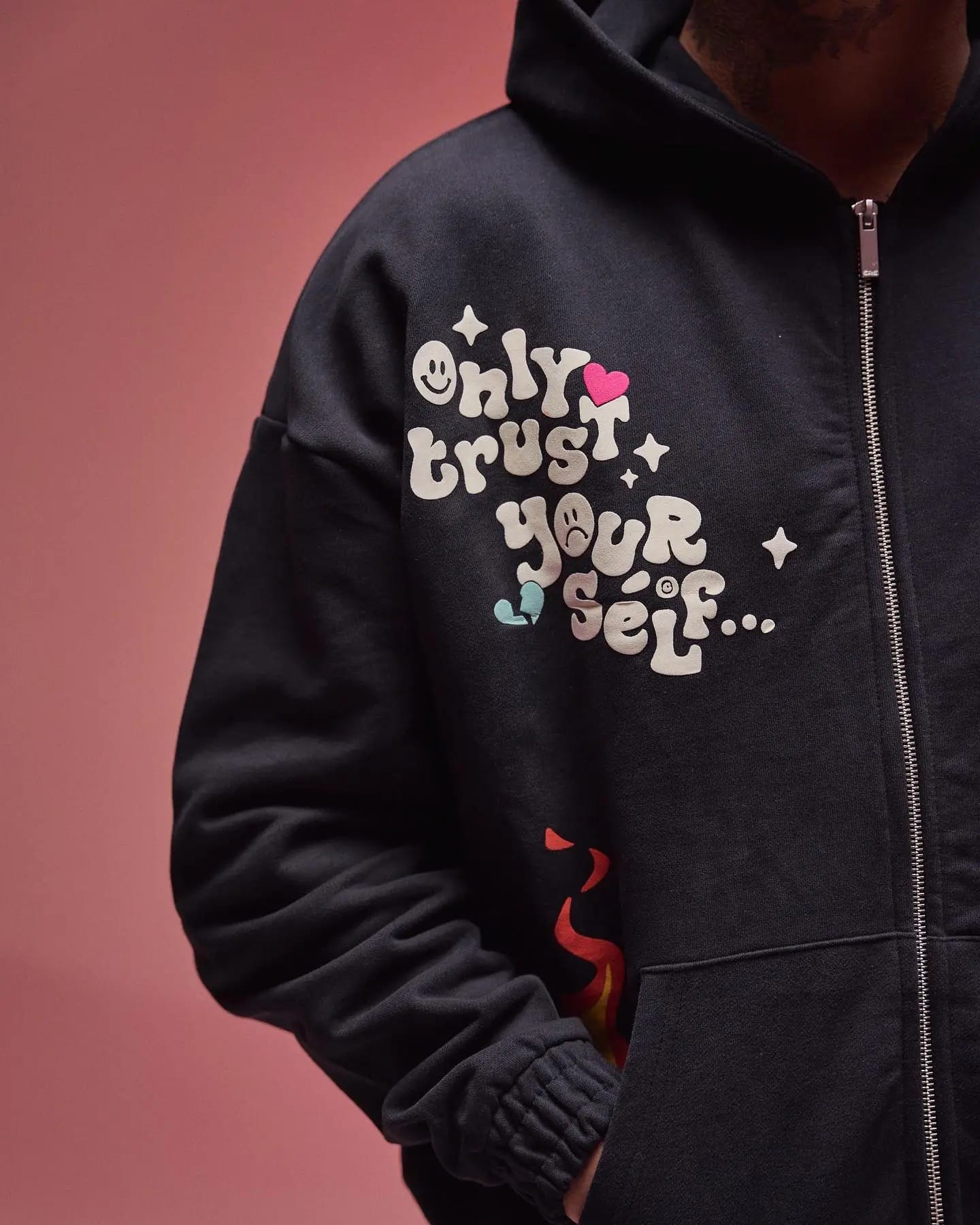 Setzen Sie ein starkes Statement mit dem schwarzen Ere Studios Zipper Hoodie. Er besticht durch die auffällige „Only Trust Your Self…“-Grafik auf der Brust, umgeben von skurrilen Sternen und Herzen. Dieser Full-Zip-Hoodie bietet Komfort und einzigartigen Style mit Flammengrafik-Akzenten an den Taschen und markanten Nähten. Perfekt, um Ihrem Streetwear-Look eine kantige, ausdrucksstarke Note zu verleihen – dieser Hoodie verbindet Komfort mit einer kompromisslosen Haltung.